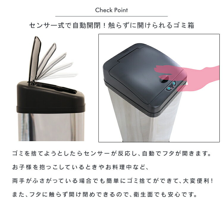 とっても便利! センサーでフタが自動開閉! 手をかざすとセンサーが感知してフタが開きます。